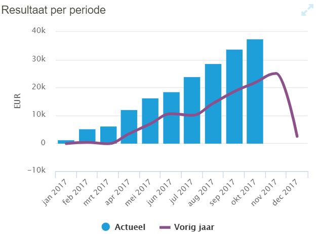 Zoals hierboven laten zien heb je de omzet, kosten en resultaten van je bedrijf altijd inzichtelijk. Zoals gezegd kan dit tot op detailniveau. Naast de grafieken kun je ook de cijfers zien, deze kunnen worden vergeleken met voorgaande jaren of bijvoorbeeld met de voorgaande periode. In de online rapportage loopt ook een constante balans, deze wordt geupdate zodra er iets geboekt wordt in de administratie.